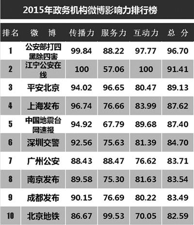 日前,在广州举行的“2016政务V影响力峰会”上,人民日报新媒体中心、人民网舆情监测室和新浪微博联合发布《2015政务指数微博影响力报告》。数据显示,政务微博已经成为很多部门和地区政务建设的“标配”,保持了较高的活跃度和广泛的影响力,给互联网舆论场带来了强大的正能量。