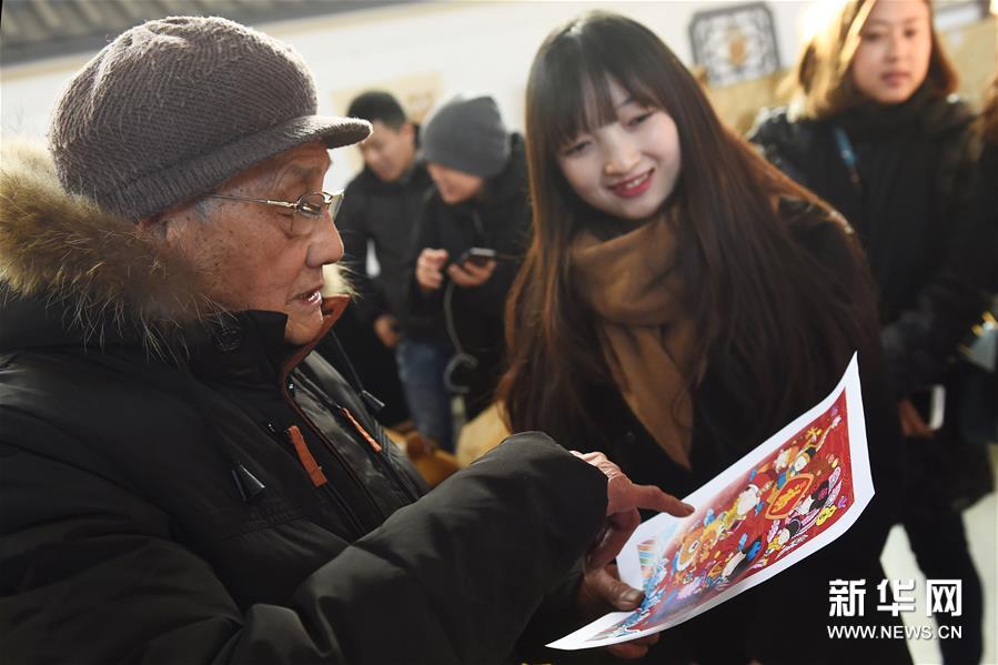 1月24日,90后的“故宫淘宝”设计师黄晶,携其创作的“皇帝赐金福、皇后赠如意”年画原型图,赴开封拜访了92岁高龄的“云记”木版年画传承人郭太运。