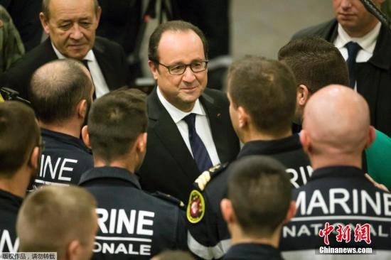 资料图:奥朗德在国防部长勒德里昂的陪同下登上“戴高乐”号航母,与执行加强打击叙利亚和伊拉克境内“伊斯兰国”任务的官兵见面。
