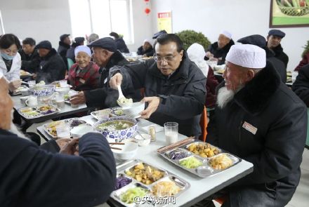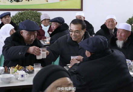 国际在线消息:李克强1日来到宁夏固原市原州区中心敬老院,与老人们在一起过小年。总理与坐在身旁的回族老人马安仓边吃边拉家常,称赞老人“红光满面”,还给他盛了一碗热气腾腾的饺子。随后,李克强起身举起手中的热饮,祝愿各位老人身体健康,幸福长寿。