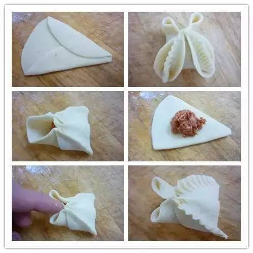 10、 知了饺子。将面皮的两边卷上来,留下小半边不卷。然后把面皮翻过来,放入馅料;将馅心包起来,把两条直边捏起来,没翻卷的面皮做成眼睛,捏出翅膀的花纹。