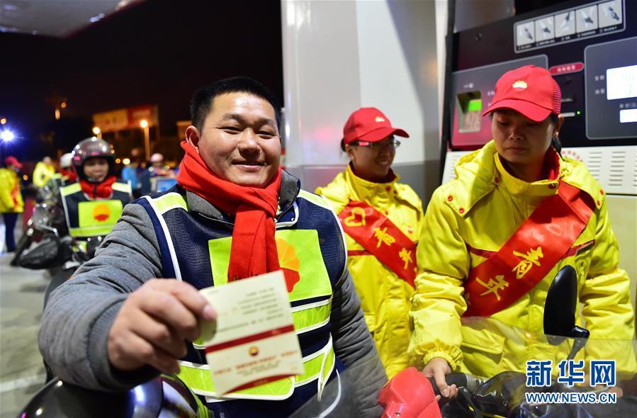 1月30日,在福建石狮荆山中石油爱心加油站,来自江西省万年县的段和新(左一)在展示中石油免费爱心加油卡,凭爱心加油卡他可以在返乡途中的62座中石油爱心加油站里免费加油。当日,由2000多名江西、安徽和重庆籍农民工及1200多辆摩托车组成的一支返乡“铁骑大军”,从福建沿海外来工主要输入地泉州、福州等地同时踏上返乡行程。为让“铁骑大军”温馨返乡,从腊月二十一至大年三十,福建、江西、湖北和湖南四省的2000多座中石油加油站都开辟春运返乡中途休息驿站和62座爱心驿站,为农民工铁骑提供免费加油、免费热饭菜、姜汤热茶水等服务,让这支返乡“铁骑大军”返乡途中更加温暖。