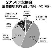 在2015年的大额捐赠中,约有61.72亿元善款投入高等教育领域,用于高校建设,奖、助学金等项目,占捐赠总额的48.17%;近42亿元捐给了各类慈善机构,并未限定所使用的领域,这部分捐赠占总额的32.75%;投入生态环境的捐赠有11.15亿元,占总善款的8.70%。