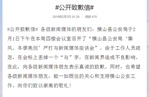 横山县公安局在上述通报中向“各级新闻媒体的朋友们”致歉称:横山县公安局于2月1日下午在本局四楼会议室召开了“横山县公安局‘秦风、冬季亮?!洗蛴胄挛琶教遄富帷?。由于工作人员疏忽,在会标上丢掉一个“与”字,在新闻界造成不良影响。在此,向各级新闻媒体朋友表示真诚的致歉。
