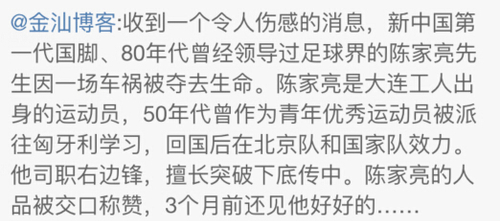 凤凰体育讯 北京时间2月2日消息,新中国第一代国脚、前中国国家足球队队长、中国足协原副主席陈家亮先生因车祸去世。