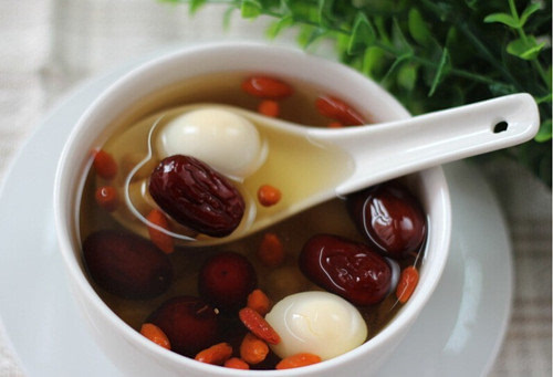 红枣加桂圆煲红糖水,到枣烂、桂圆绵时,打只鸡蛋,继续用小火焐熟鸡蛋。红枣、桂圆和红糖都有补血的功效,煮出的鸡蛋很滋补。