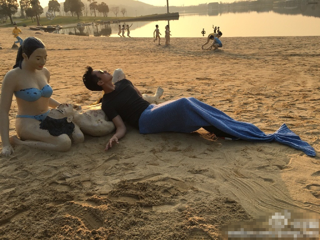 照片里,邓超扮成一条“美人鱼”与沙滩上的人像“嬉戏”,很是欢乐。