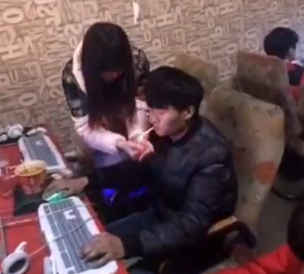 关键词:男子网吧打游戏 女友喂饭点烟按摩