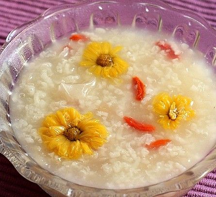 菊花择去蒂,上笼蒸后,取出晒干或阴干,然后磨成细末,备用。粳米淘净放入锅内,加清水适量,用武火烧沸后,转用文火煮至半成熟,再加菊花细末,枸杞子继续用文火煮至米烂成粥。每日两次,晚餐食用,有补肝肾、益精血、降血压之功效。