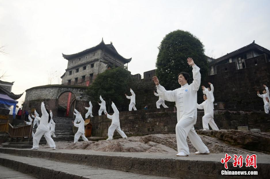 2月6日清晨,湖南凤凰县太极协会的太极拳爱好者们在凤凰古城的沱江边打起了太极,以此迎接即将到来的春节,呼吁大家健康养生。 杨华峰 摄
