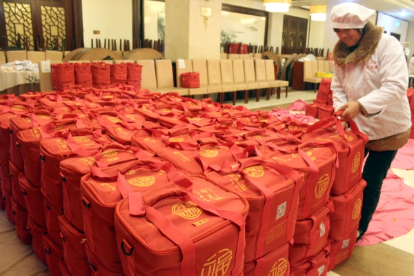 2月6日,苏州观前街一家餐馆的服务员在搬运“打包年夜饭”。