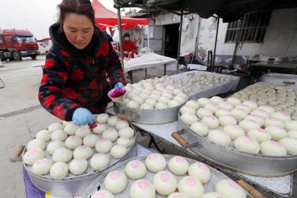 2月5日,江苏省连云港市赣榆区青口镇小荒村村民在赶制“团圆馒头”,供应节庆市场。新华社发(司伟 摄)