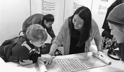 近日,纽约当地小朋友参加“欢乐春节·艺术中国汇”系列活动,近距离欣赏中国书法作品。本报记者 李晓宏摄