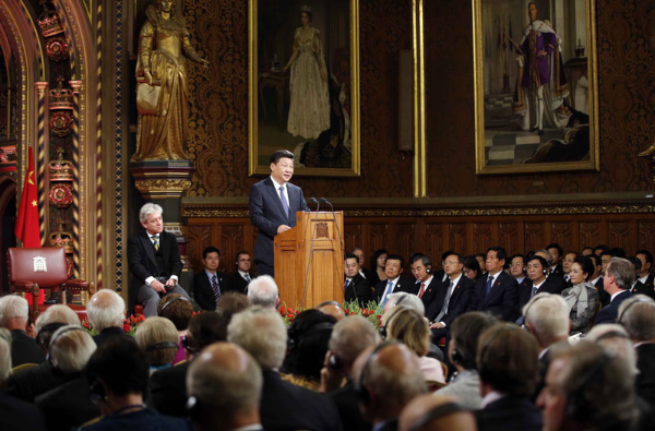 10月21日,习近平来到伦敦金融城,发表《共倡开放包容 共促和平发展》的重要演讲。习近平阐述了对英国的历史文化看法和中国当下的现状和今后的发展理念。习近平指出:“我们要坚持长远和战略眼光,我们要坚持开放包容的心态,我们要坚持合作共赢的理念,我们要坚持开拓进取的精神,共同开启中英关系的‘黄金时代’,努力为人类和平与发展的崇高事业作出新的更大的贡献!”
