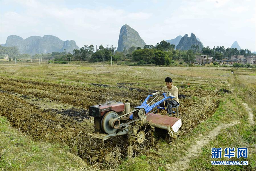 2月10日,广西昭平县黄姚镇新寨村一名农机手在田垌里耕田整地。春节期间,各地农民抓住晴好天气犁田松土,为新一年的春耕、春种作准备。 新华社发(黄旭胡 摄)