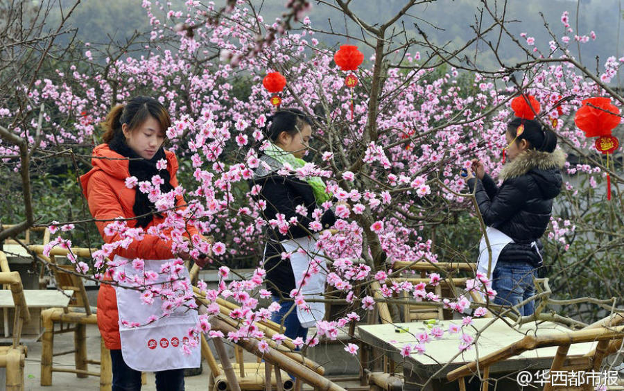 2月11日消息,成都龙泉山的农家乐因等不到桃花盛开,扎起假花,吸引游客。