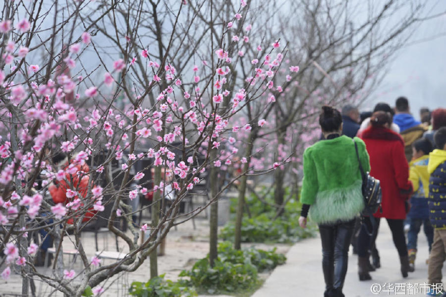 2月11日消息,成都龙泉山的农家乐因等不到桃花盛开,扎起假花,吸引游客。