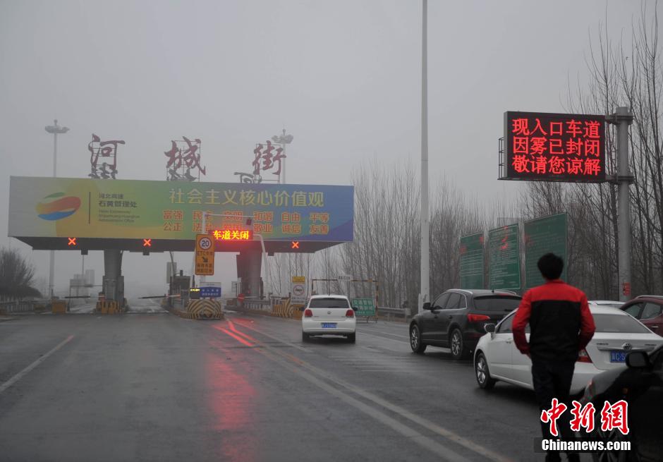 2月12日春节假期,受大雾影响,河北沧州的河城街和大陈庄高速口,上道出行的民众排队等待。河北高速交警总队指挥中心官方微博显示,宣大高速、张石高速蔚县段、唐津高速、秦皇岛的沿海高速以及北京以南石家庄周边沿线站口等多条高速全部关闭。 中新社记者 翟羽佳 摄