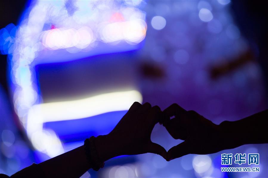 2月12日,市民在观看灯饰时做出桃心的手势。当日,为迎接情人节,澳门特区政府旅游局在氹仔龙环葡韵圆形剧场为“2016浪漫情人节之光影童话梦”光雕表演举行开幕礼。据了解,本次光雕表演将持续到2月29日。新华社记者 张金加 摄