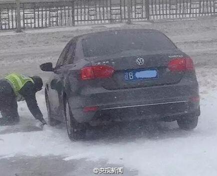 大连交警雪中推车 因太累马路上跪倒休息(图)