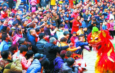 游客正在京郊怀柔红螺寺新春庙会上观看舞狮子。春节假期,每天都有数以万计的游客走进红螺寺新春庙会。本报特约摄影 卜向东