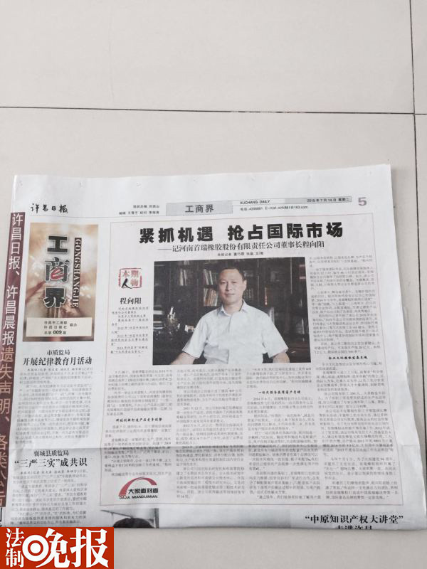 据法晚记者了解,程向阳系许昌市工商联副主席、襄城县政协委员,同时他还是河南首瑞橡胶股份有限公司的董事长。2013年,程向阳还获得了“许昌市优秀中国特色社会主义建设者”称号,并且被评为2014年许昌市“创新发展”十大民营企业家之一,襄城县劳动模范……·2015年7月14日,其人物事迹也被许昌日报大篇幅报道。