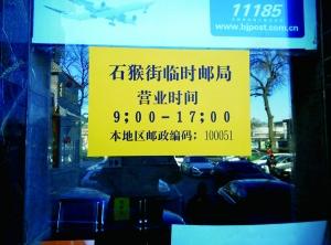 昨日上午,北京晨报记者来到位于西城区和平门邮政支局内的石猴街临时邮局,邮局大堂内摆放有三四座“石猴街”临时邮局原地实寄服务及特色集邮产品销售的宣传牌。