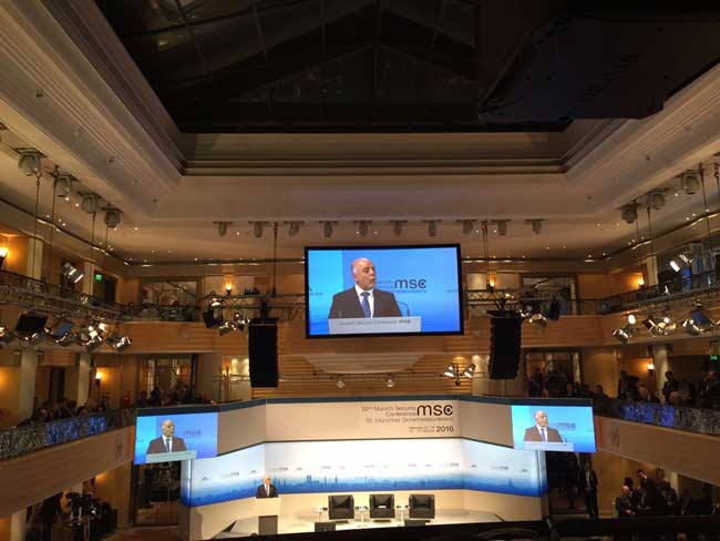 慕尼黑安全会议原名世界防务大会,是德国在1962年冷战最危险的时候创办的。最初研讨的重点为跨大西洋关系和欧洲安全,带有浓厚的“大西洋色彩”,成为观察欧洲安全走向的“风向标”。1995年,第32届慕尼黑安全政策大会首次邀请俄罗斯代表与会,并首次提出北约东扩的原则。随着全球化进程的发展,慕尼黑安全会议逐渐演变为全球性质的安全政策研讨会。本次会议将持续至14日,约30位国家元首和政府首脑、70多位外长和防长、5位情报部门首脑等约600名代表出席,他们主要围绕欧洲难民危机、叙利亚?;⒋蚧骺植乐饕?、网络安全等关乎全球稳定与安全的议题展开讨论。