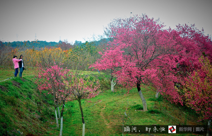 2016年2月14日,广东韶关某公园,樱花绽放,游客驻足欣赏、拍照留影,提前感受踏青赏花游花园乐趣。