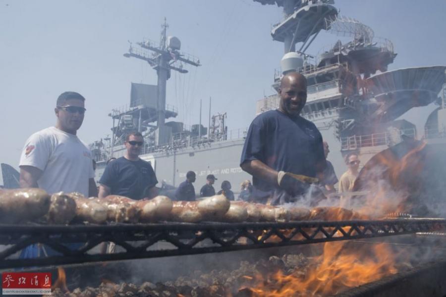 2月16日消息,海军长年在海上部署,对于水兵来说是一件非??菰锏氖虑椤N嵴袷科?,欧美海军舰艇通常会组织一些娱乐活动。例如烤肉大会。图为2016年1月30日,在阿曼湾部署的美国海军奇尔沙治号(LHD—3)两栖攻击舰就组织了一次盛大的聚餐大会,其主打食物就是烤肉烤肠。