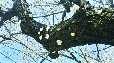 武汉一老梅树“逢春” 粗大树干上罕见开花(图)