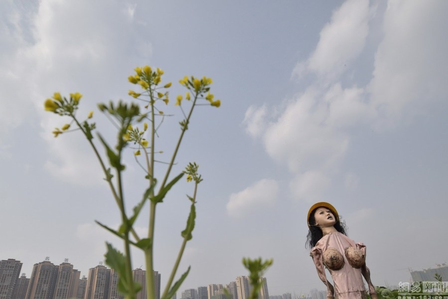 农民用充气娃娃伪装稻草人