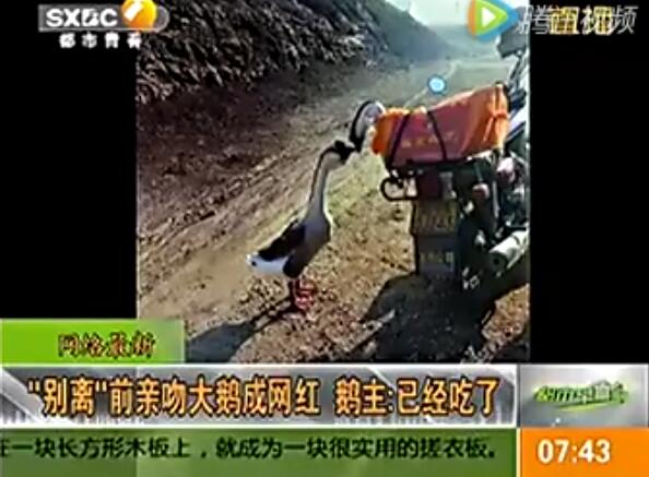 一只母鹅被捆放在摩托车上,一只公鹅站在摩托车下,两只鹅嘴对嘴,像是离别前的亲吻,再次相见,已是来生。此去一归期,生死两茫茫。从情人节那天开始,这两只在别离前亲吻的大鹅,瞬间刷屏朋友圈,成为新年第一对“网红”。