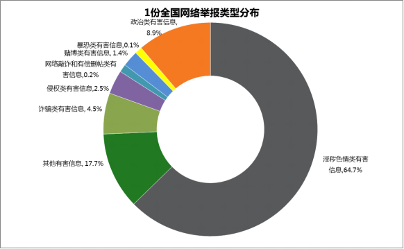 综合分析全国举报情况,淫秽色情类有害信息举报仍较为突出,达137.8万件,占比64.7%;政治类有害信息举报占比8.9%;诈骗类有害信息举报占比4.5%;侵犯网民权益类有害信息举报占比2.5%;赌博类有害信息举报占比1.4%;网络敲诈和有偿删帖类有害信息举报占比0.2%;暴恐类有害信息举报占比0.1%;其他有害信息举报占比17.7%。其中,鼓吹“台独”、宣扬民族分裂等有害言论,假冒微信红包、假冒机票改签等网络诈骗,受到网民集中举报、谴责。