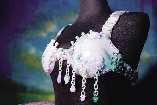 作品采用了上等的三彩翡翠一体式雕刻,历时三年雕刻而成,是一件独特的可穿着的翡翠作品,“采用了独创的平面取环手法,让翡翠内衣十分贴身,穿起来和真正的内衣一样?!弊髌氛瓜至酥泄车窨碳挤ā盎罨贰钡拇葱戮辰纾艿揭的谌耸康母叨绕兰?。