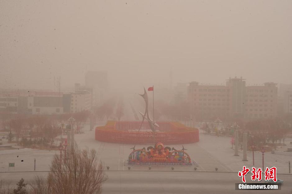 2月18日,地处甘肃河西走廊西部的酒泉玉门市出现猴年第一场扬沙天气,瞬间最大风力达9级,局部地方出现沙尘天气。图为扬沙天气里的玉门市区能见度低。 杨棋焜 摄