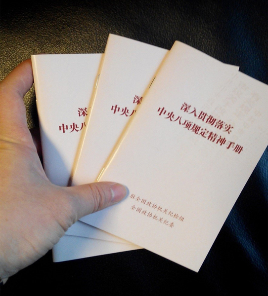 派驻纪检组与机关纪委编印了一本手掌大、便于携带的小册子——《深入贯彻落实中央八项规定精神手册》,发放到机关及直属单位1200多名党员干部手中,督促大家按章依规办事。其主要内容包括中央八项规定、中央和中央纪委及全国政协机关有关文件规定,并特别编入了精心挑选的17起典型案例等。由于针对性强、简便实用,有同志评价说,“小册子在手,遵守八项规定精神不用愁”。