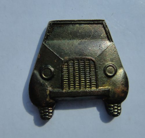 第四种为高仿精品,图示这枚汽车兵符号即属此类。为何称高仿精品,因为这类东西虽不是原发品,但据说是用当年的模具制作的,所以形状、颜色与原品极为相似。缀钉在领章上,不要说初学者,就是有着几年研究经验的人也难辨别真伪。如果将其取下仔细观察反面,就会发现其冲压痕迹没有原品清晰,材质较薄,焊接工艺也有欠缺。尽管如此,它的价值也远远超过了影视作品中的道具。(周伟)