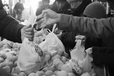 某农贸市场顾客正在用塑料袋装水果。本报记者 王伟伟/摄