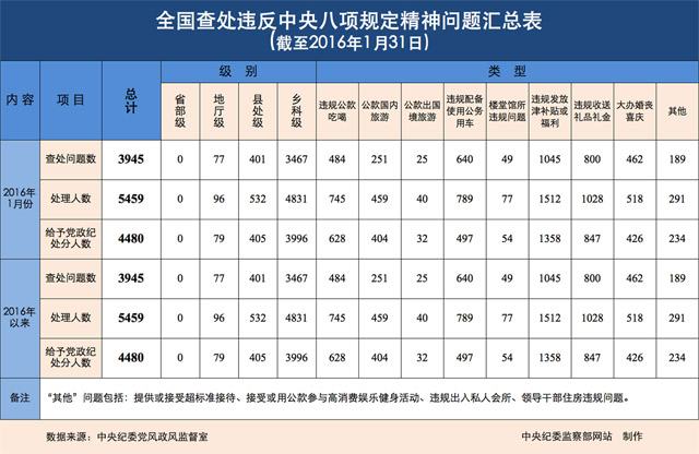 人民网北京2月22日电 中央纪委监察部网站今日发布1月份全国查处违反中央八项规定精神问题情况。截至1月31日,全国查处违反中央八项规定精神问题3945起,处理5459人,给予党政纪处分4480人。