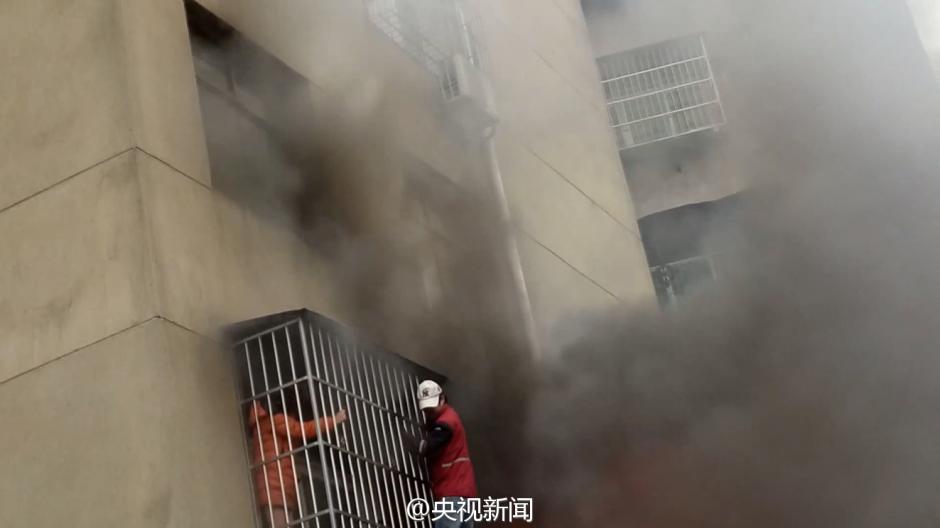 近日,湖北一户居民家着火冒出滚滚浓烟,一女子被防盗网困??!对面小区整理包裹的快递员张洋见状跑来,徒手爬上阳台,用手肘使劲撞开防盗网,终将女子救出!(央视记者吴绍钧)
