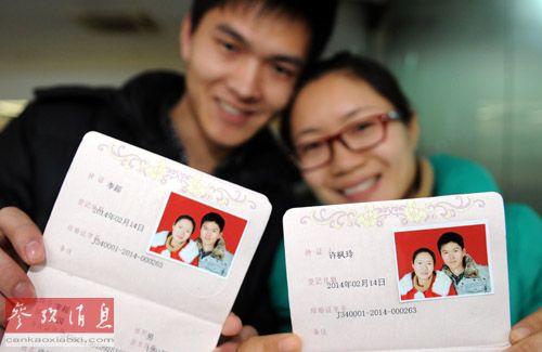 ?。苍拢保慈眨诤戏适芯橐龅羌谴?,一对新人展示领取的结婚证。新华社记者刘军喜摄