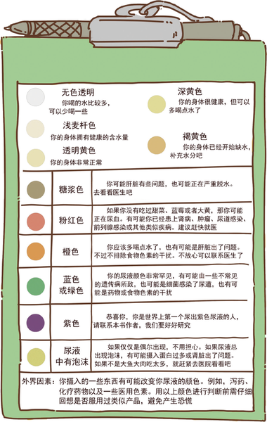 一个最直观的方法就是观察小便的颜色。在全球享有盛誉的美国克利 夫兰诊所(Cleveland Clinic)推出过一个“尿液比色卡”,形象地指导人们根据尿液颜色来判断缺水的程度。