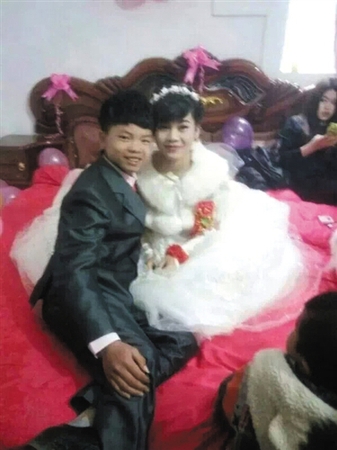 网传照片中,张某身穿西服,脚穿皮鞋,身穿白色婚纱的女方吴某同样稚气未脱,二人在婚床上正面对镜头微笑。