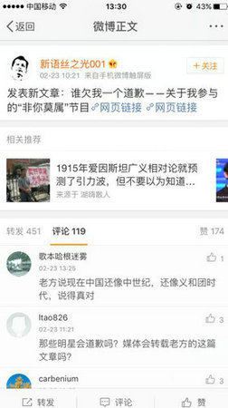 后来人们发现“诺贝尔哥”说的“引力波”和科学界说的引力波不是一回事,这个“诺贝尔哥”还有很多不靠谱的言论,甚至被认为是精神病人,但很多人仍然因为我没有尊重一个精神病人的发言权,没有风度没有教养,要我道歉。再后来又有人说“非你莫属”这个节目是专门奚落、嘲笑人的,找了一个疯子让嘉宾玩弄,太欺负人了,还是要我道歉。非要把我弄成“道歉哥”不可。
