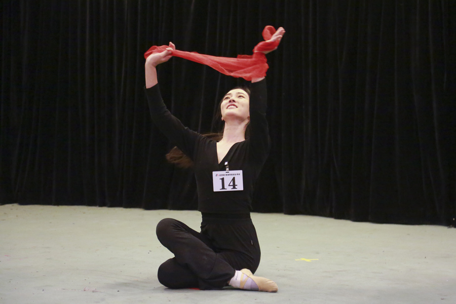 2月23日,偶像女子组合SNH48的成员赵嘉敏在北京电影学院表演学院艺考复试考场内表演。