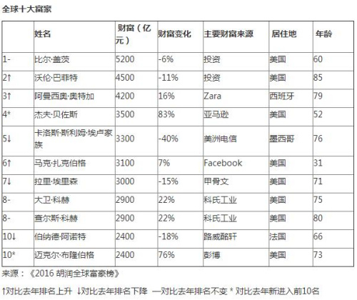 榜单显示,《2016胡润全球富豪榜》,共计来自68个国家的2188位十亿美金富豪上榜,比去年增加99人,达历年最高。