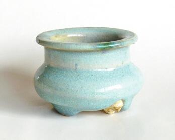 这只元代的 钧瓷小香炉,玲珑精致,牙白色胎上满施天蓝色釉,自然流淌的釉水微垂于底部,口沿自然窑变的绿斑,使之略显俏皮,让人爱不释手。钧瓷兴盛于宋金,中心窑厂 位于河南禹州市。到了元代,各地窑厂竞相烧制。与宋代钧瓷整体釉面厚薄均匀的特征不同是,元钧釉面大多有垂釉现象,正是这种垂釉使元钧看起来显得粗狂、奔 放,这只鹤壁窑的钧瓷香炉造型简洁,釉面莹润、肥厚??诰?.5cm,高5.5cm,其制作精美,釉色清新,似在等待有美人添香。