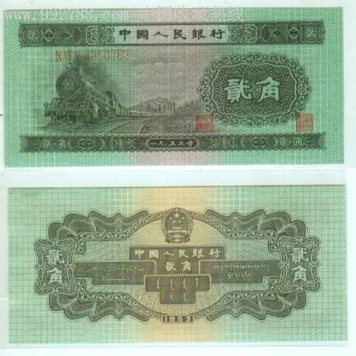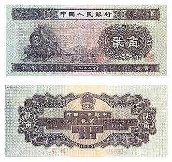 第二套人民币贰角券,该币1553年制版,1955年3月1日发行,1971年11月只收不付,1999年1月1日停止流通。正反两面都以墨绿 色为主色,正面图景是火车头。该币的市场人气很旺,早在流通期间就已增值近千余倍,增长势头一如火车头一样,势不可挡, 目前市场价格已近1800元。