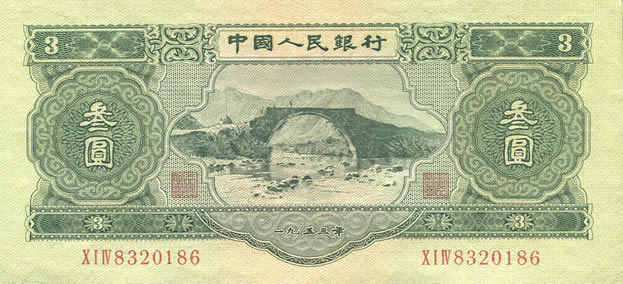 第二套人民币叁元券,该币1953年制版,由前苏联印刷并于1955年3月1日发行,期间因为苏中关系发生变化,1964年5月15日就被迫停 止收兑立即退出流通领域。该纸币正反两面都是以深绿色为主色,正面图景是革命根据地井冈山。在收藏领域,此纸币一直表现出稳定的增长趋势,价格始终保持向 上增长的势头,目前市场价格已经到了42000元。